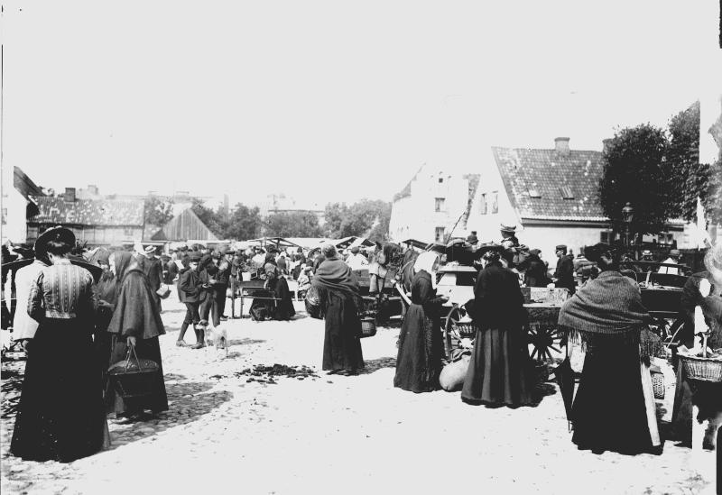 Lund. Lundaarkeologiska avdelningens fotonegativ. Uppgift saknas i liggaren. Torghandel på Mårtenstorget omkring 1900.