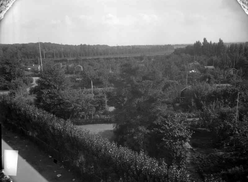 fotografi, gräsmatta, flaggstång, himmel, häck, träd, kolonistuga, byggnad, väg