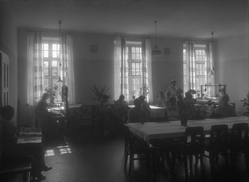 fotografi, sjukvård, bord, växt, golv, interiör, taklampa, blomkruka, tidning, gardin, sjuksköterska, duk, patient, dörr, fönster, vävstol, mentalsjukhus, stol, person, kvinna