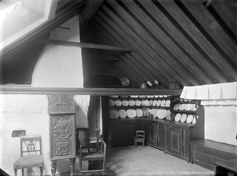 fotografi, järnugn, tallrik, stol, bänk, skåp, skorsten, mugg, golv, bjälke, tak, interiör