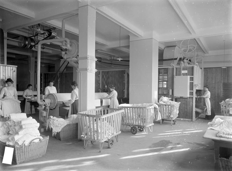 fotografi, pelare, sjukhus, interiör, tvätteri, tvätt, förkläde, kvinna, mangel