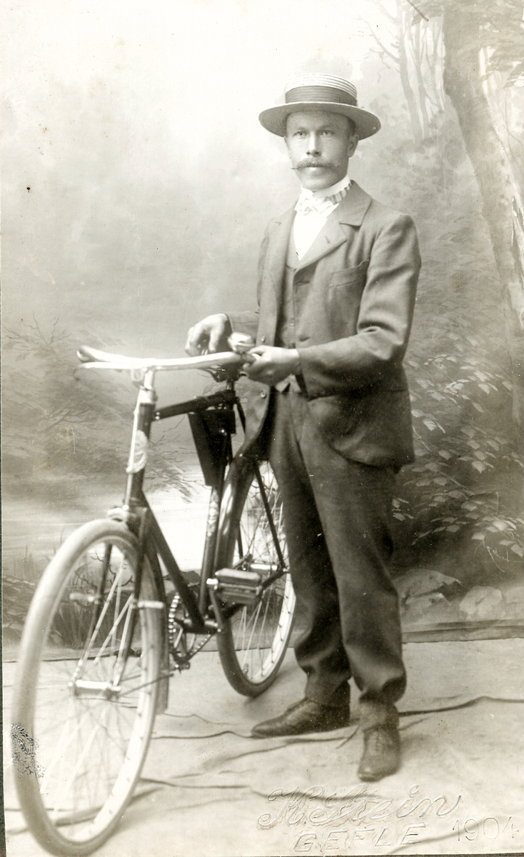 Porträtt av man i kostym som står med en cykel.