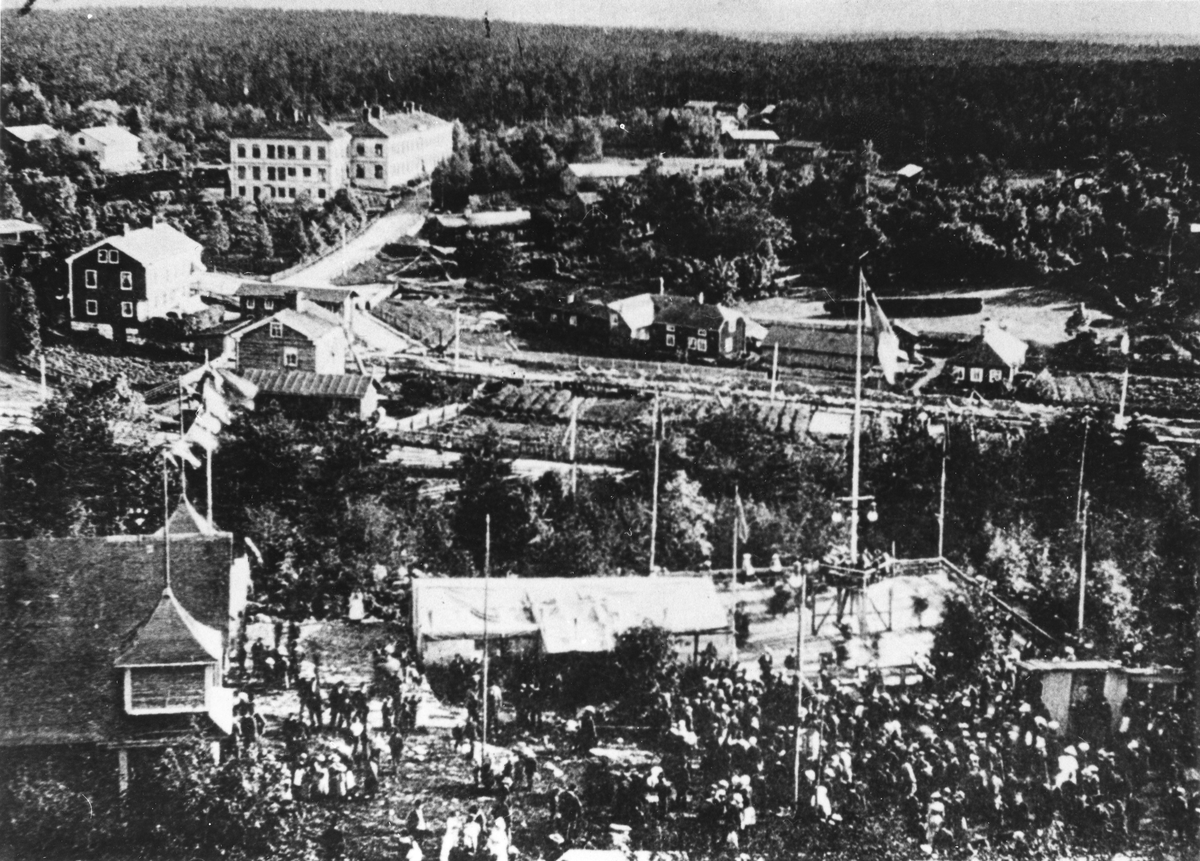 Utsikt mot söder från Östra Berget i Söderhamn. I mitten av bebyggelsen utmed Trädgårdsgatan, i backen till vänster Söderhamns lasarett och i förgrunden fest-platsen på Östra Berget. Foto i slutet av 1800-talet.