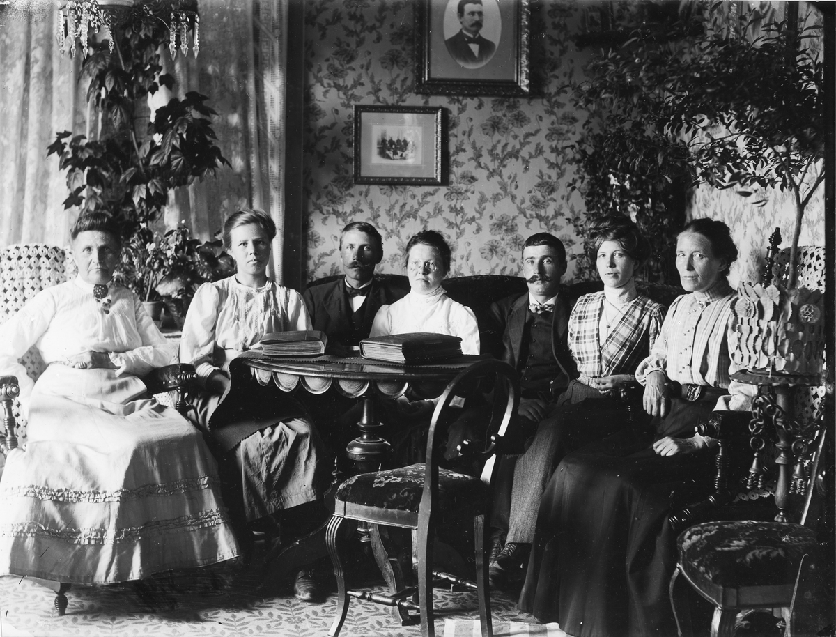 Anna, Ester och Gustav Sandlin, dennes fru plus okända. O. G. Sandlins porträtt".