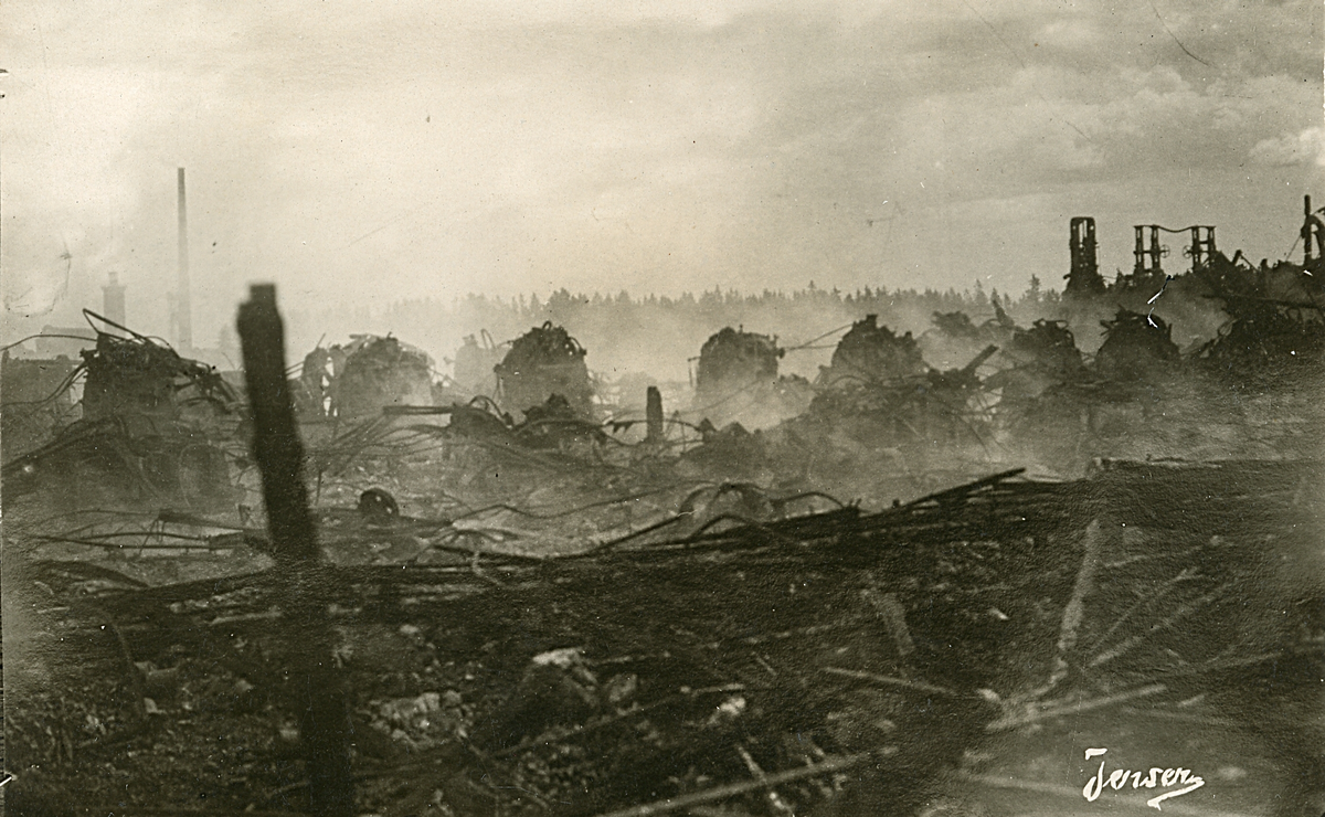Troligen rester efter en industribrand. Text framsida kort: Jensen (otydligt).