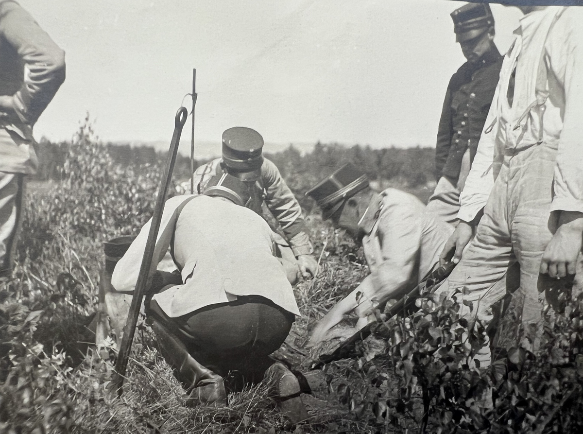 Smålands artilleriregemente, A 6. Anläggande av "Centralvägen" på A 6 övningsfält. Fr o m dornspettet fr v: löjtnant Rudberg, underlöjtnant Törnblom, kapten B P Löwenadler, underlöjtnant Adlercreutz. Foto från c:a år 1920.