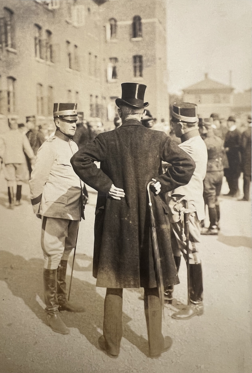 Smålands artilleriregemente, A 6. Regementets 25-årsjubileum. På kaserngården. Fr v överste P A L R Hammarskiöld (C. A 6), "Flemming", överste A H Steuch (C. I 12). Foto från år 1920.