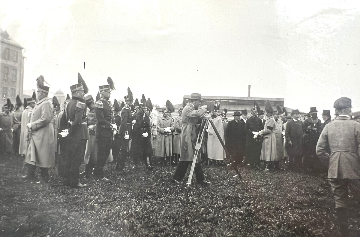 Smålands artilleriregemente, A 6. Fotot taget på I 12:s kaserngård, sannolikt vid regementets 300-årsjubileum (1623-1923). Med utgångspunkt från mannen med filmkameran, nr 5 fr v löjtnant T V P Landegren. Foto sannolikt från år 1923.