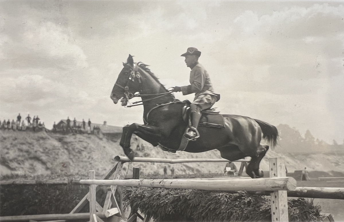 Smålands artilleriregemente, A 6. Löjtnant friherre G A Lagerfelt på hästen "Völund". Foto från c:a år 1915-1920.