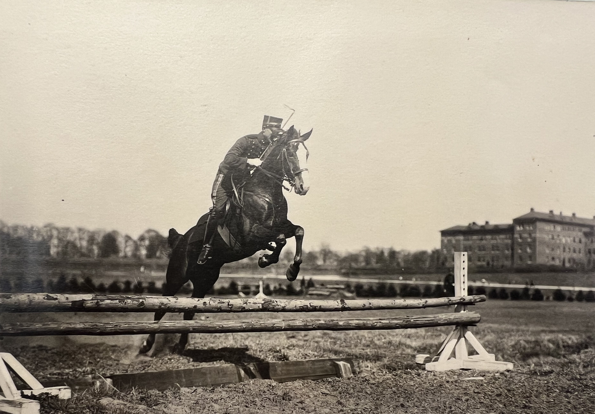 Smålands artilleriregemente, A 6. Löjtnant S R A Palmborg på hästen "Svalan". Foto från c:a år 1915-1920.
