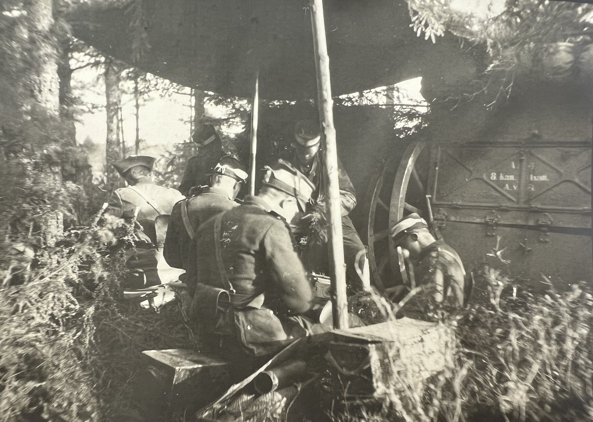 Smålands artilleriregemente, A 6. 7,5 cm kanon m/1902, på maskerad grupperingsplats, i Skillingaryd. Foto från år 1918.