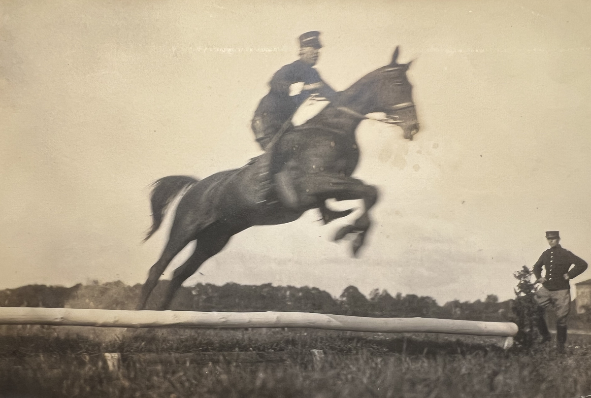 Smålands artilleriregemente, A 6. Regementets 25-årsjubileum. Hästhoppning. Löjtnant T Melander. Foto från år 1920.