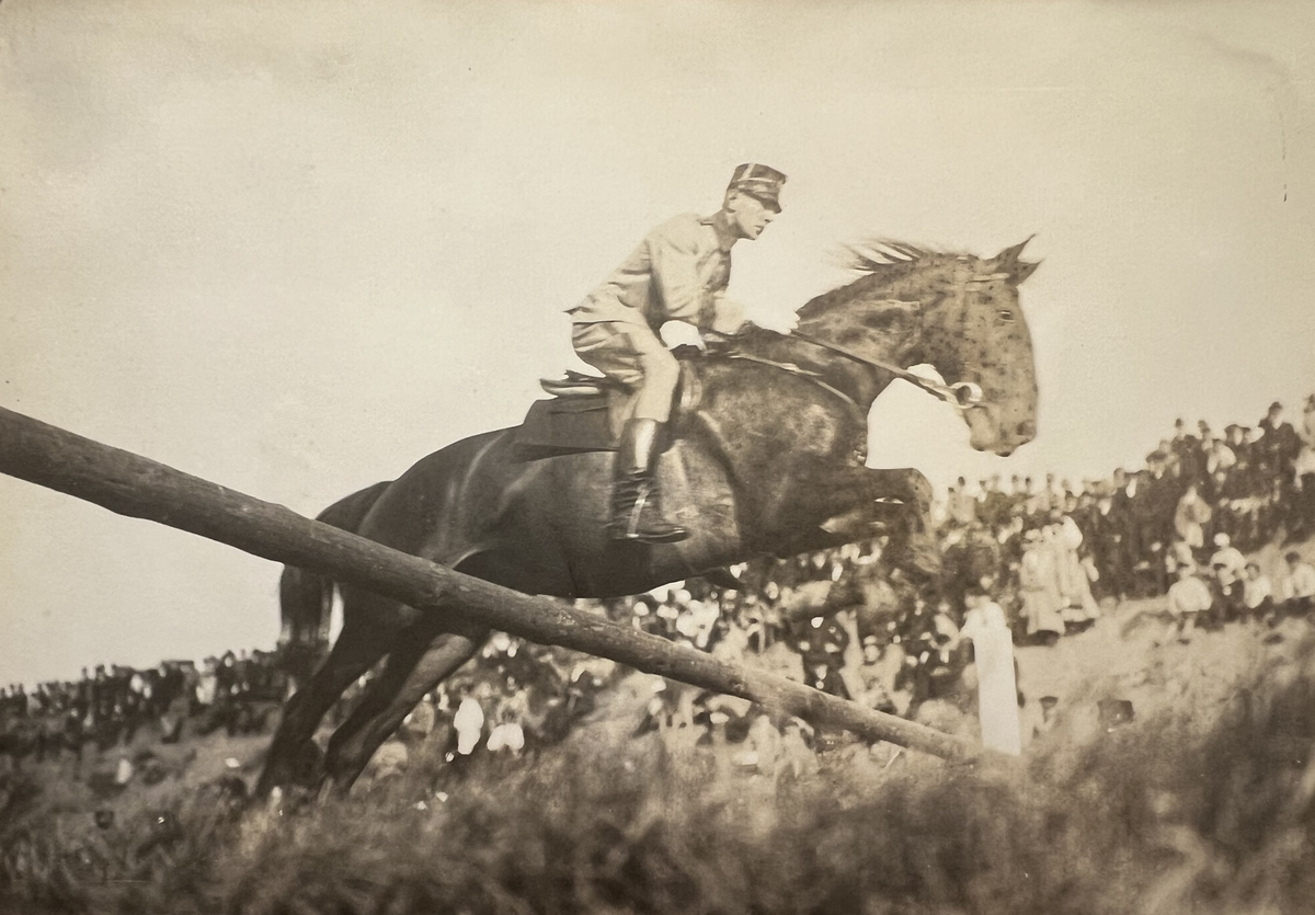 Smålands artilleriregemente, A 6. Regementets 25-årsjubileum. Hästhoppning. Underlöjtnant Rudling på hästen "Dux". Foto från år 1920.