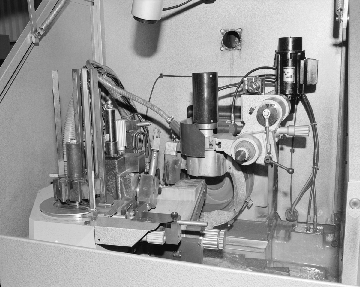 SLIPNING AV SVARVSKÄR. I vissa fall skall skäreggarna förstärkas genom att förse dessa med en c:a 0,2 mm bred fas runt hela skäret. Bilden visar en av de maskiner som användes för denna operation. Till vänster i bilden finns 2 st vertkalt placerade magasin avsedda för in- respektive utmatning av skären. Slipcykeln är automatisk.