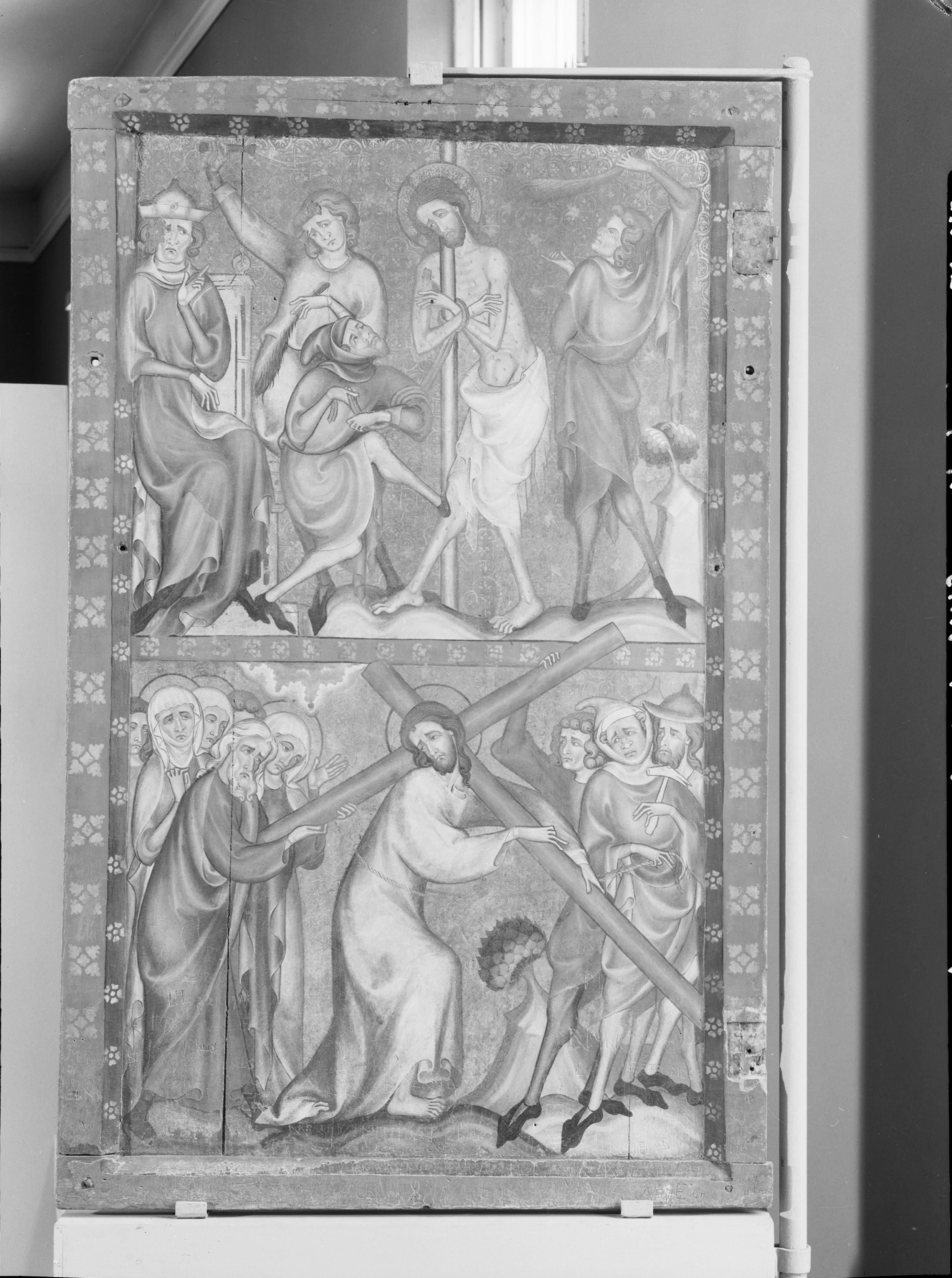Dörr till triptyk, innersidan med Gisslingen och Korsbärandet. Tyskt arbete från 1300-tal.