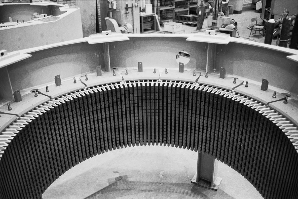 Svetsning, plåtläggning av statorer. Hall 6. Färdigplåtlagd odelad statorstomme.