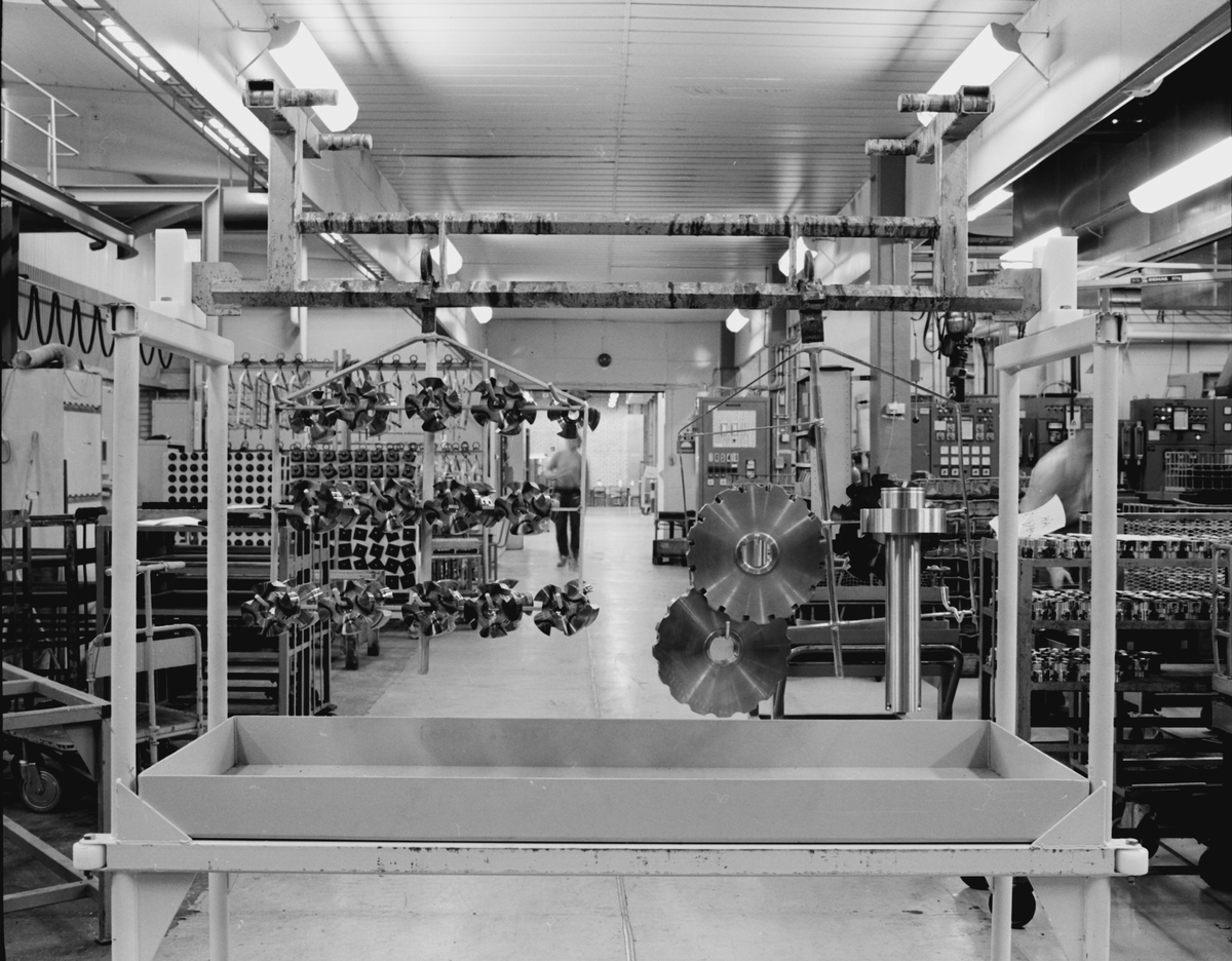 Allmänt: Värme och ytbehandling. Operatbärare med olika produkter för insättning i ytbehandlingslinjen.