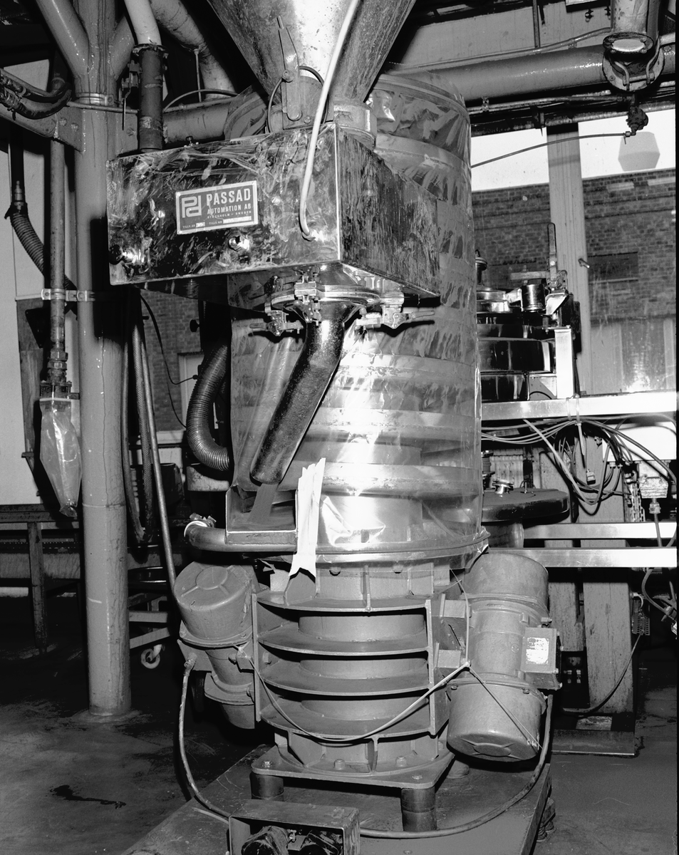 Utmatningssluss från spraytork med spiralkylare. Kylaren inklädd med plastfolie för att skydda hårdmetallpulvret från föroreningar.