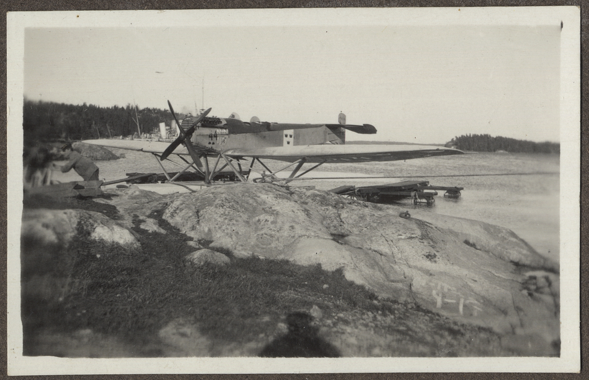 Bilden visar ett sjöflygplan typ Heinkel HE 2 i en skärgårdsmiljö. Två män arbetar framför flygplanet.