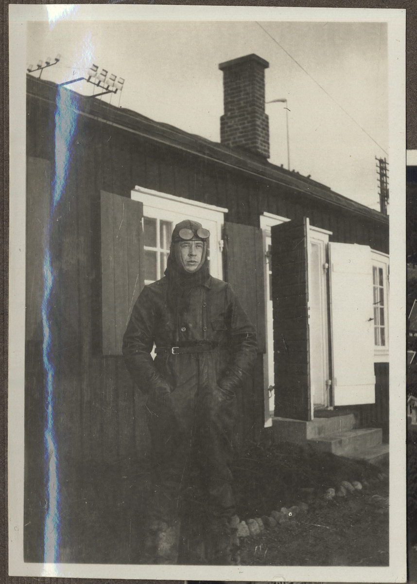 Porträtten visar en flygare i flygdräkt som står framför en låg träbyggnad.