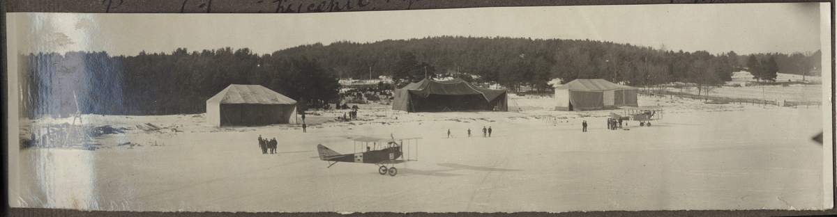 Bilden visar flygstationen i Hägernäs i vintertid. Det syns tre stora tält som fungerar som hangarer och två flygplan typ SK 1 Albatros.
