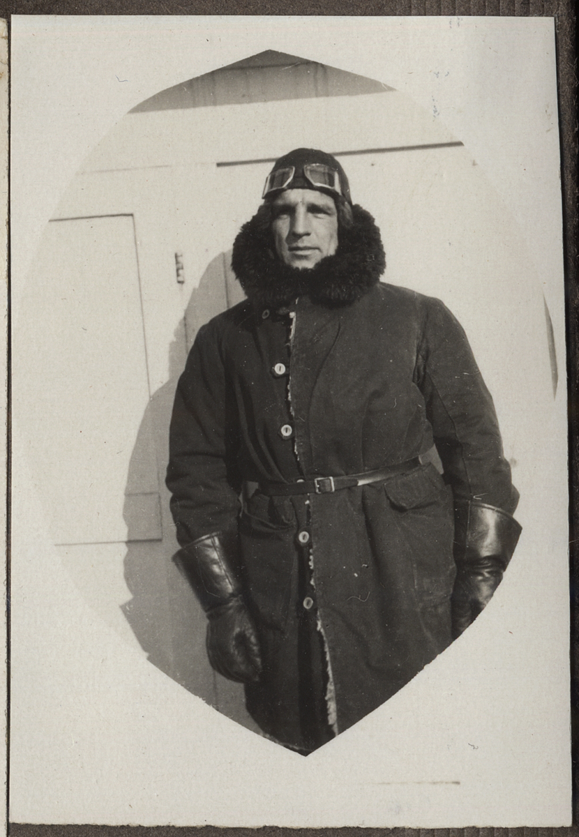 Porträtten visar flygaren Acke i flygardräckt bestående av en tjock kappa, vantar, huvudbonad i läder och glasögon.