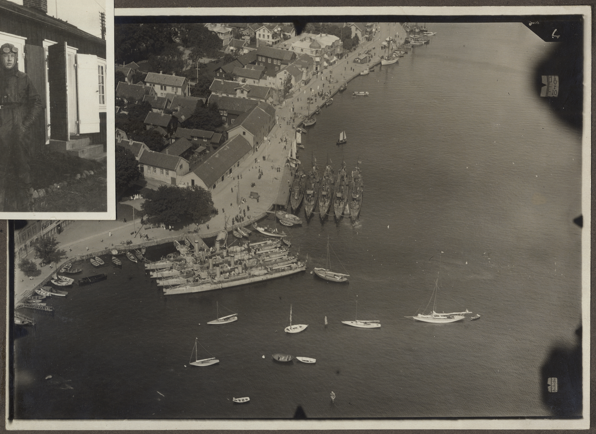 Detta flygfoto visar torpedbåtar som ligger förtöjda vid en brygga utanför Marstrand. I förgrunden syns flera småbåtar till ankars. Vid höger bildkanten finns exponeringar av mätinstrument.