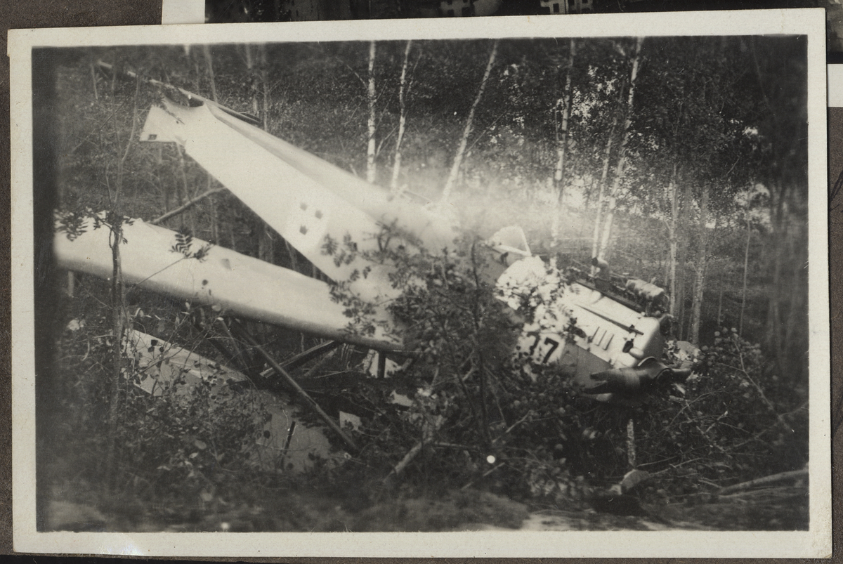 Bilden visar en nedstörtat sjöflygplan typ S 2 i skogen.