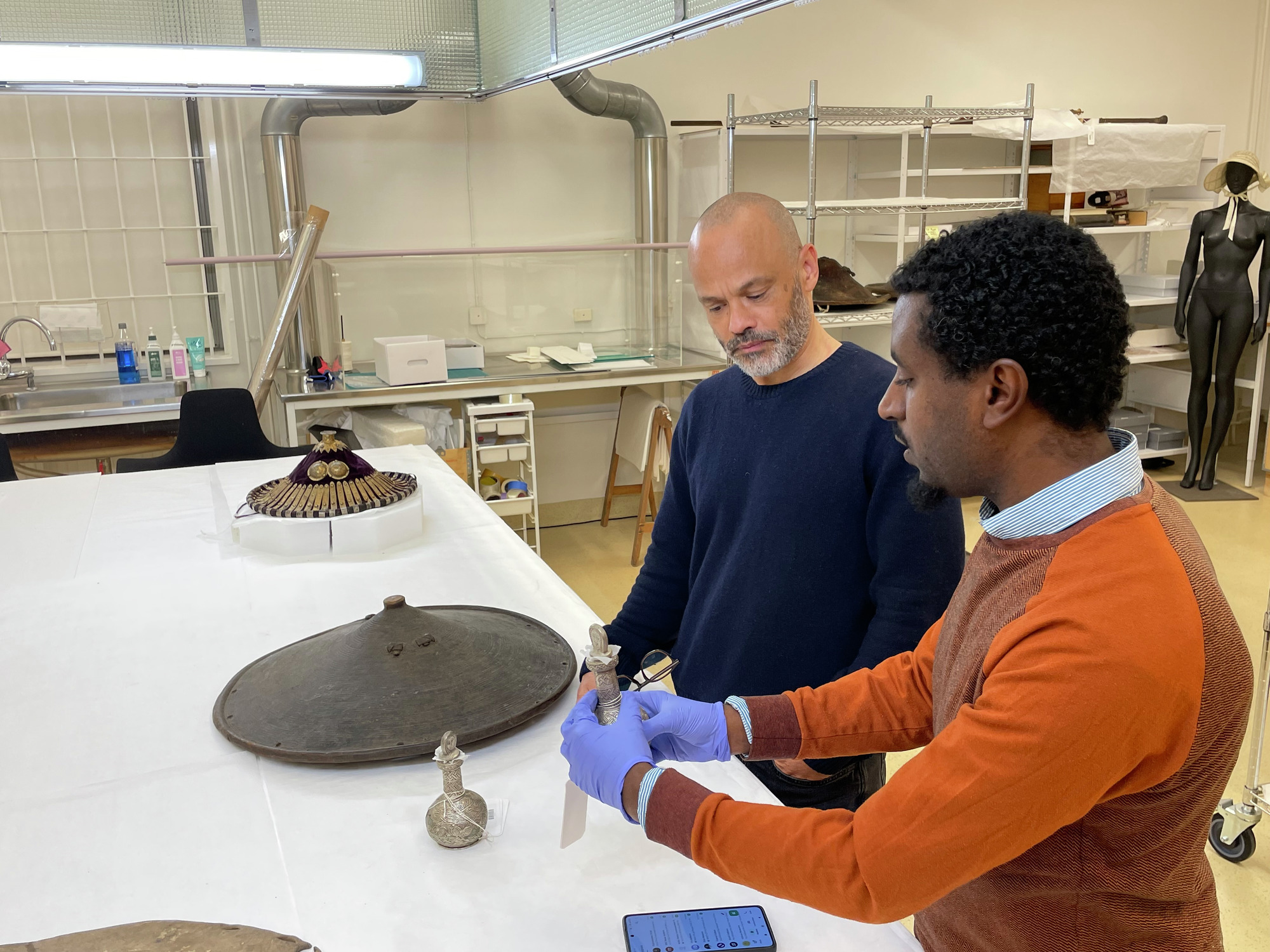 Michael Barrett och Abel Assefa visar föremål i samband med samlingsbesök Etnografiska museet 2025.