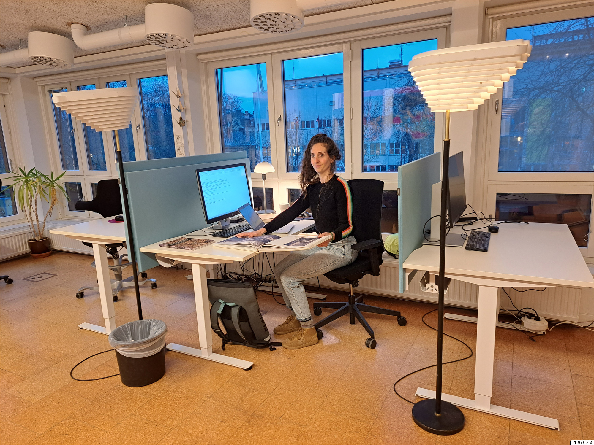 Héloïse Dazard vid skrivbord, kontorslandskap i biblioteket, Etnografiska museet. Under höst och vinter 2025 praktiserade Dazard vid Etnografiska museet och dokumenterade bland annat museets tapassamlingar.