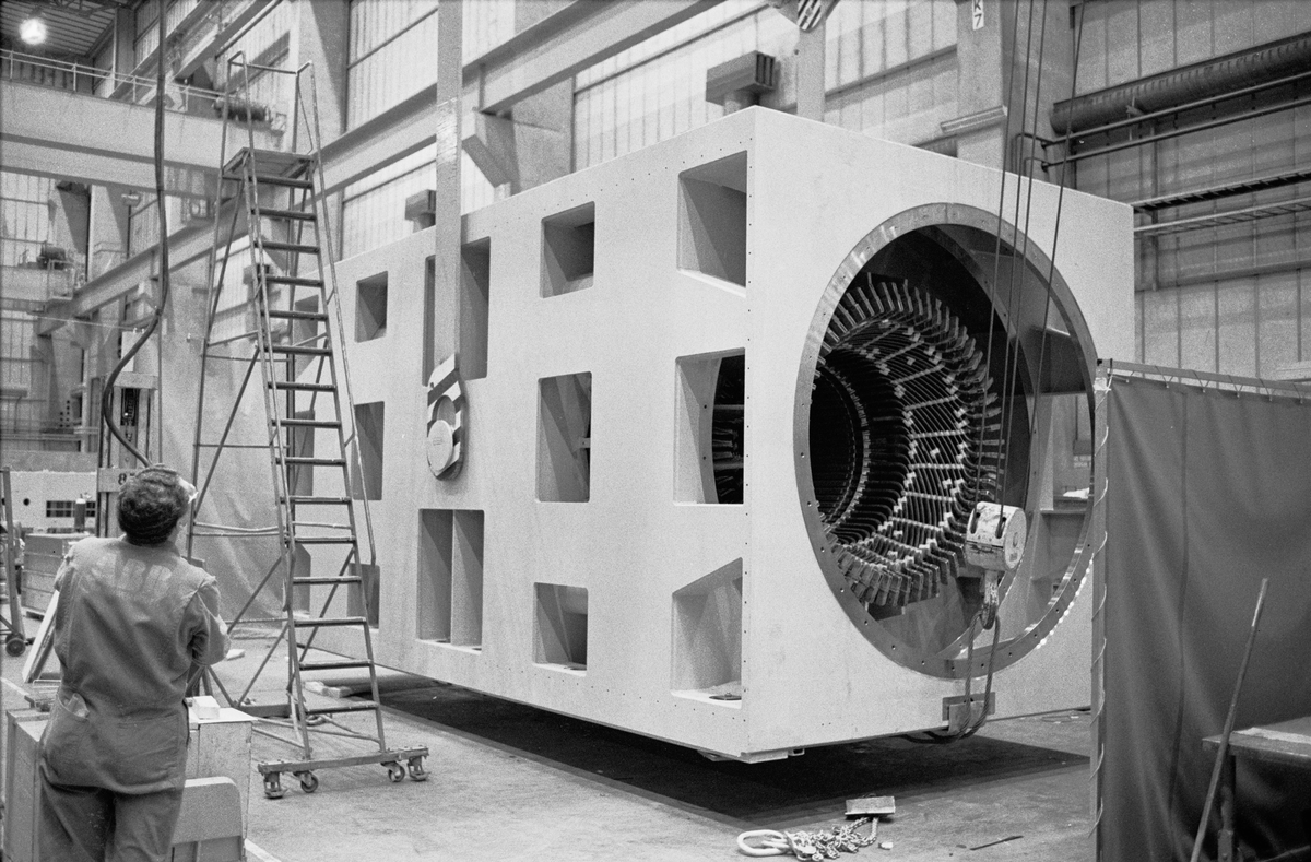 Svetsning, plåtläggning av statorer. Hall 6. Vändning av statorstomme.