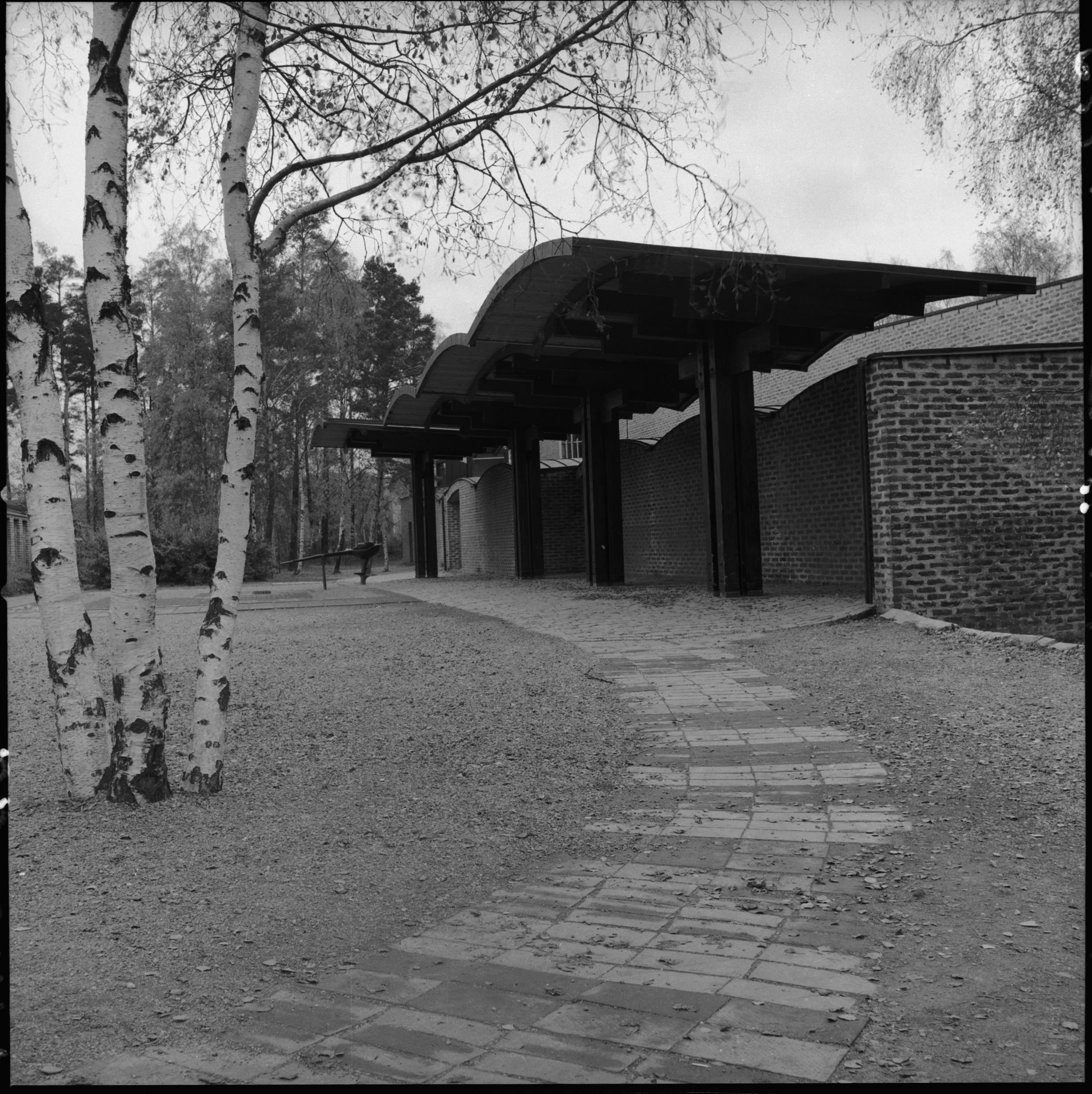 Kyrkan mot nordväst, i förgrunden skulptur vid Spegeldammen.