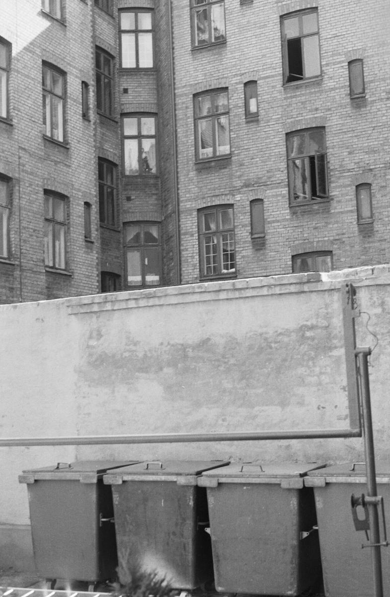 byggnad, fönster, hus, soptunna, soptunnor, byggnader