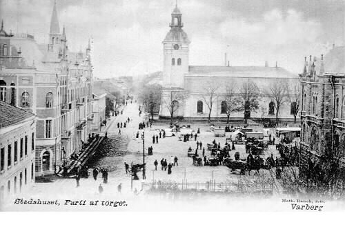 Vykort, "Stadshuset, Parti af torget. Varberg". Torghandel pågår denna vinterdag. Stadshuset/stadshotellet uppfört 1902 ses till vänster vid Kungsgatan, kyrkan vid torgets norra sida och Sparbankshuset skymtar till höger i bild.