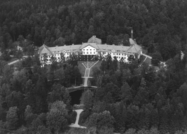 Flygbild över Spenshults Reumatikersjukhus, tidigare sanatorium, med omgivande park och skog. Parken har anlagda promenadvägar och en damm. Gårdsytan framför byggnadens centrala parti har nu fått en strängt geometrisk utformning, där en triangel har ersatt den tidigare gårdsrundeln. (Jämför med bildnr FFH2325.)