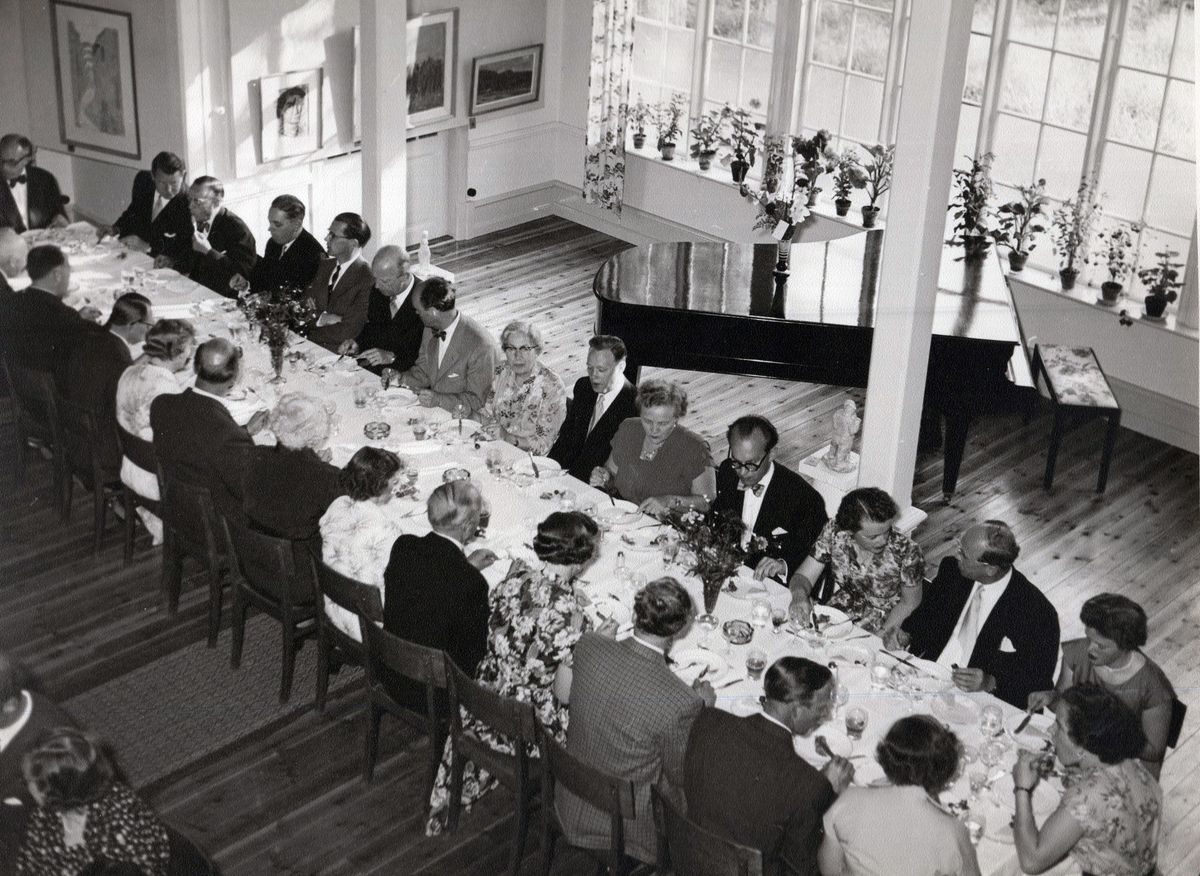 50-årsjubileum den 3 juli 1954 för Kustsanatoriet Apelviken. Middag vid långbord på Societetsrestaurangen. I bakgrunden står en flygel. (Se bildnr KSA137-KSA159.)