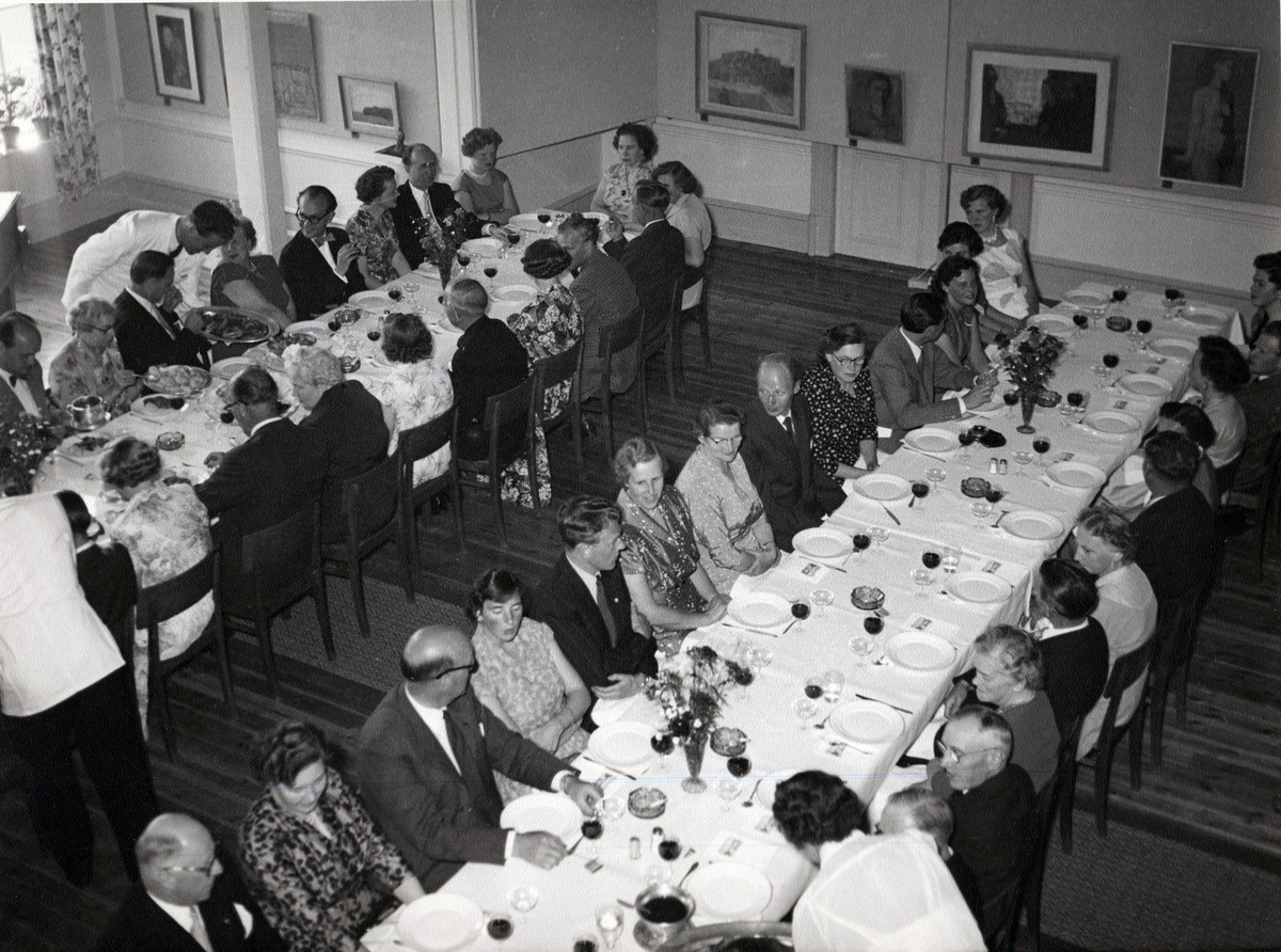 50-årsjubileum den 3 juli 1954 för Kustsanatoriet Apelviken. Middag vid långbordd på Societetsrestaurangen. En gäst tar från servitörens serveringsfat. Längs väggarna står skärmar med modern konst.