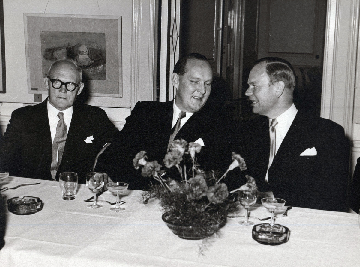 50-årsjubileum den 3 juli 1954 för Kustsanatoriet Apelviken. Middagsgäster vid långbord i Societetsrestaurangen. På bordet står en skål med nejlikor och ett askfat. Meddela oss gärna om du vet namnet på någon av herrarna! (Se bildnr KSA137-KSA159.)
