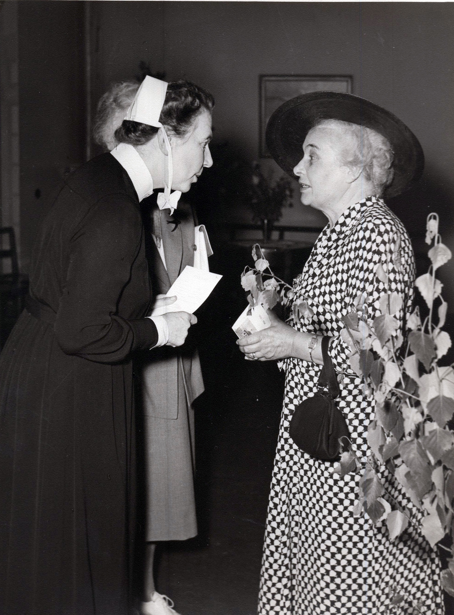50-årsjubileum den 3 juli 1954 för Kustsanatoriet Apelviken. Två kvinnor i samtal. Den ena bär någon form av sjuksköterskedräkt. (Se bildnr KSA137-KSA159.)