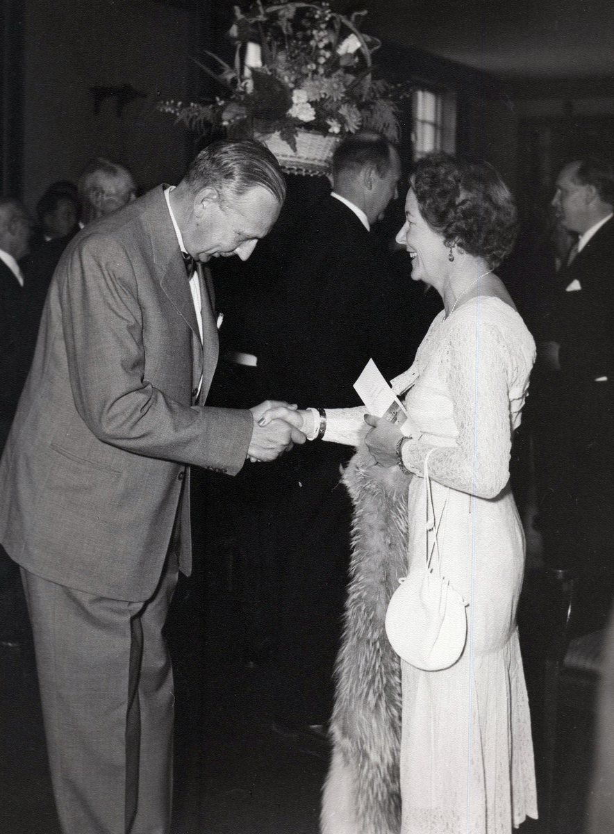 50-årsjubileum den 3 juli 1954 för Kustsanatoriet Apelviken. Ett par gäster hälsar på varandra. Troligen är kvinnan Frida Ahlberg, gift med överläkare Albert Ahlbert på Kustsanatoriet. (Se bildnr KSA137-KSA159.)