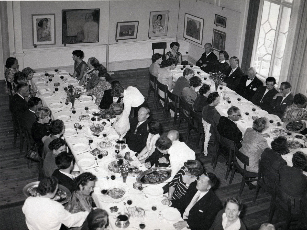 50-årsjubileum den 3 juli 1954 för Kustsanatoriet Apelviken. Middag vid långbord på Societetsrestaurangen. Gästerna tar mat från serveringspersonalen stora brickor. Längs väggarna står skärmar med modern konst. (Se bildnr KSA137-KSA159.)