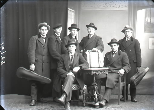 Ateljéfoto av sju unga män i ytterkläder. Troligen är det en orkester då ett par har håller i var sin fiollåda. Möjligen är det också ett dragspel i fodral som står på bordet. Beställare: John Börjesson från Hunnestad.