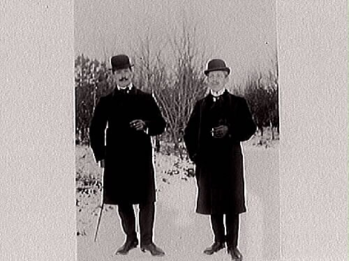Snöbild. Två herrar i kubb tar varsin cigarett under en promenad i vinterlandskap. Fotograf okänd.
