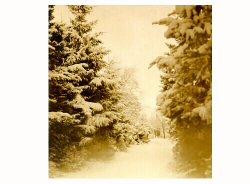 Snöbild. Promenadväg mellan granar i vinterskrud på Påskberget.