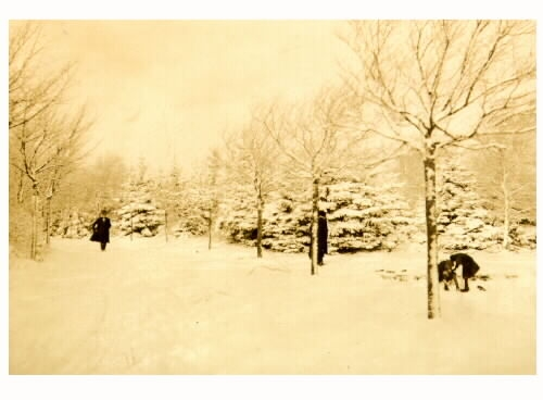 Snöbild. Några personer i vinterlandskap vid Påskbergsdammen.