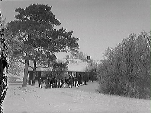 Snöbild. En grupp av människor framför en långsträckt huslänga. I förgrunden ett par tallar och buskage.