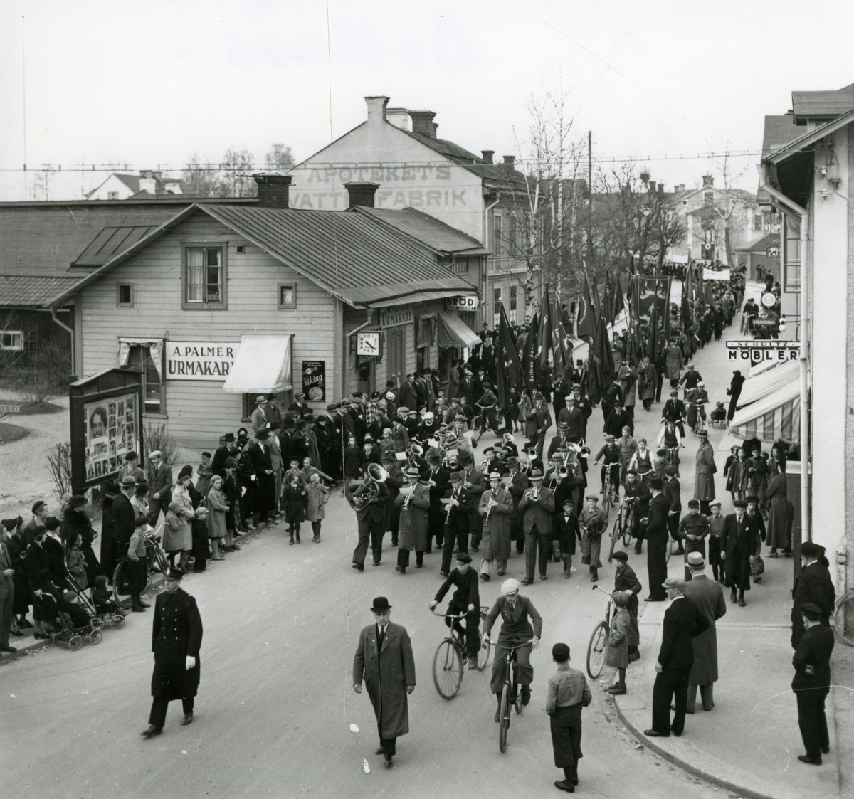 Bollnäs omkring 1940. Ett socialdemokratiskt demonstrationståg på Långgatan den 1:a maj.