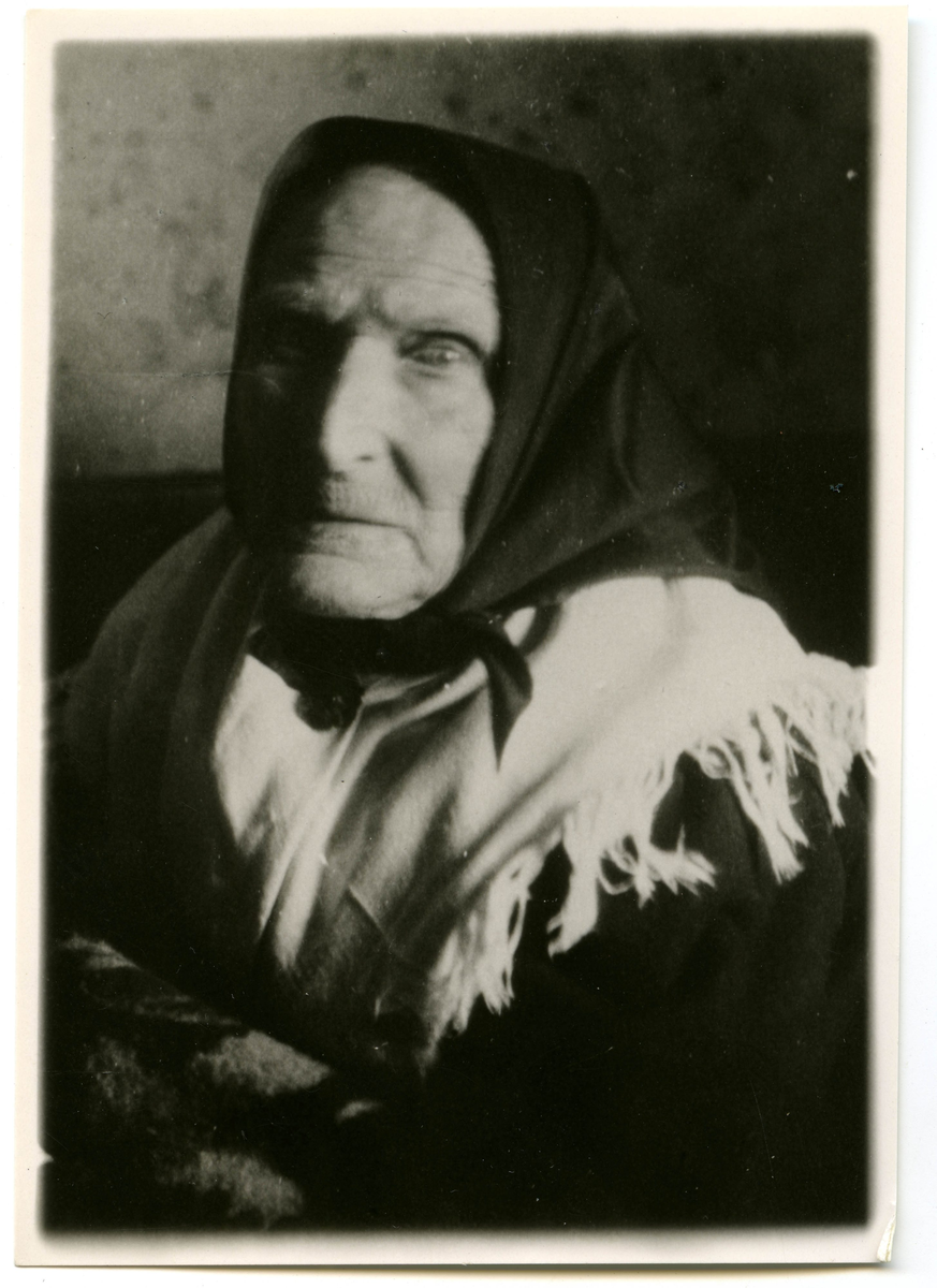 Porträtt på Kajsa Mikaelsson i N. Sunnerbo, Gnosjö. född 23 december år 1827 och död 18 oktober år 1927.