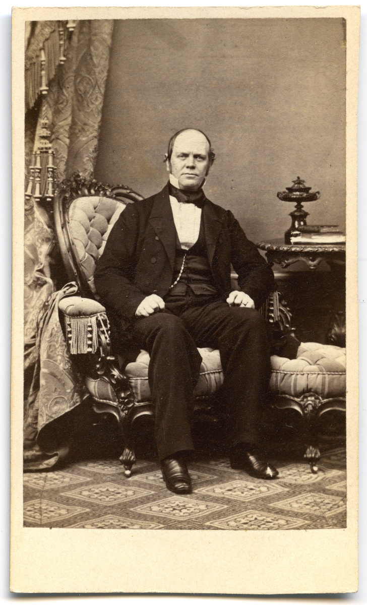Porträtt på en man i helfigur, sittande.