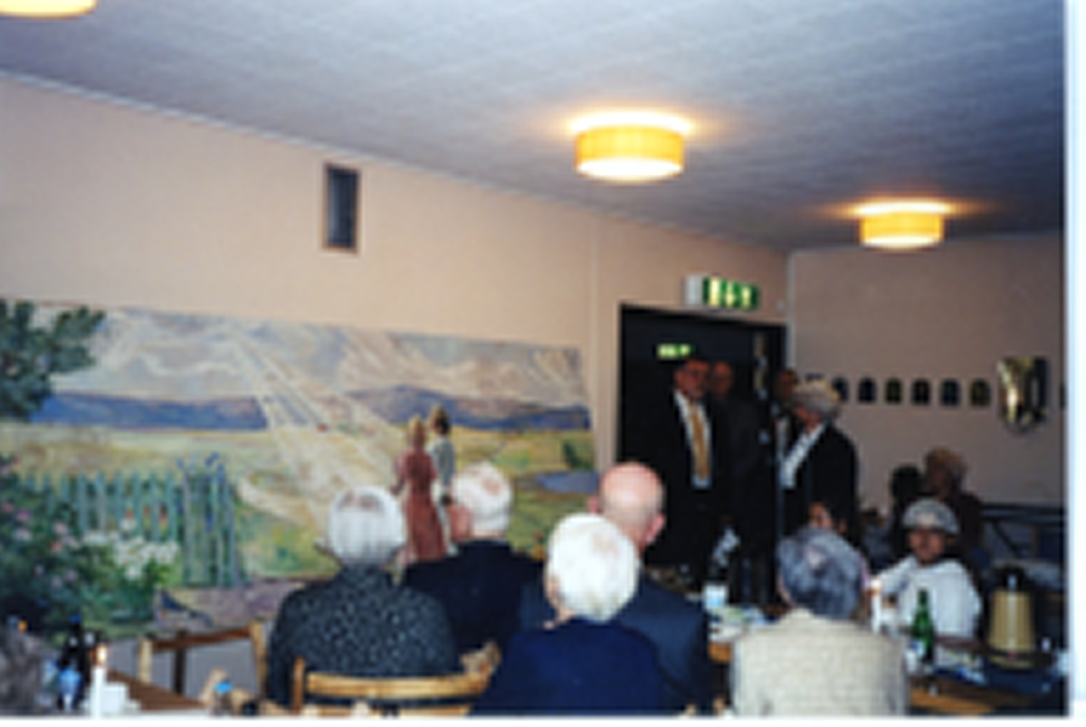 Apelgården kyrkas 20-årsjubileum 2002-09-29. Komminister Gustav Lindman talar till församlingsmedlemmar som sitter i Karolinasalen. Till vänster ses en tavla målad av Saga Walli. Den var en invigningsgåva till församlingen från Kållereds hembygdsförening år 2002. Tavlan hade tidigare hängt i Torrekulla flickhem och köptes av hembygdsföreningen och skänktes till Kållereds församling.